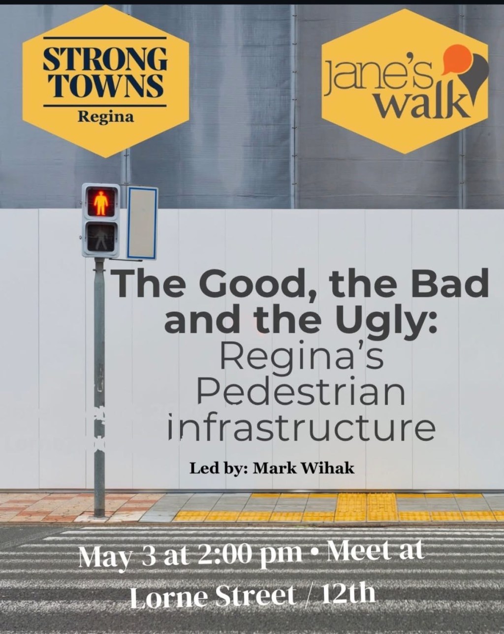 I’m looking forward to leading my first Jane’s Walk on Sunday, May 3rd. While I’ve enjoyed going on a number of Jane’s Walks, this will be the first time I’ve led one. I’m going to use Regina’s ailing downtown as a way to look at pedestrian infrastructure: sidewalks, traffic signals, and urban design to examine what’s working and what could work better. Thanks to Megan Kuznitsoff and Nick Kowalchuk of Strong Towns Regina for helping to pull together the 2026 edition of Jane’s Walk in Regina. 2:00 p.m. Sunday, May 3rd at the corner of 12th & Lorne outside the Regina Public Library.