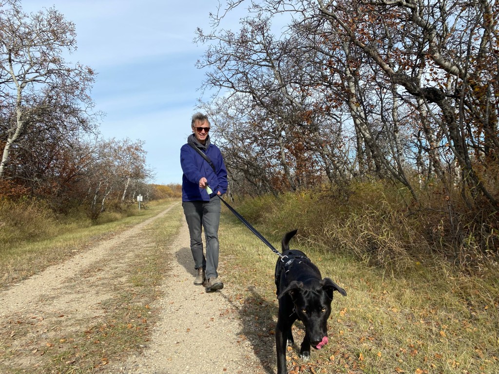 I’m Mark Wihak, the person behind Project Pedestrian. I’m a filmmaker and educator living on Treaty 4 lands in Regina, Saskatchewan, Canada. Walking has been an important part of my life ever since I meandered down the back alleys to and from elementary school. I’ve walked in England’s Lake District, spent a week walking across Luxembourg, and on a steamy June day my spouse Wanda and I walked the Manhattan length of Broadway from the Harlem River Ship Canal to the harbour at Bowling Green. But I don’t consider myself a “serious walker”*. I’ve not done any of the major pilgrim walks or hiking trails and probably won’t. Most of my walking is in the cities I’ve lived in and visited, and lately often in the company of a lovely long dog named Marlene.